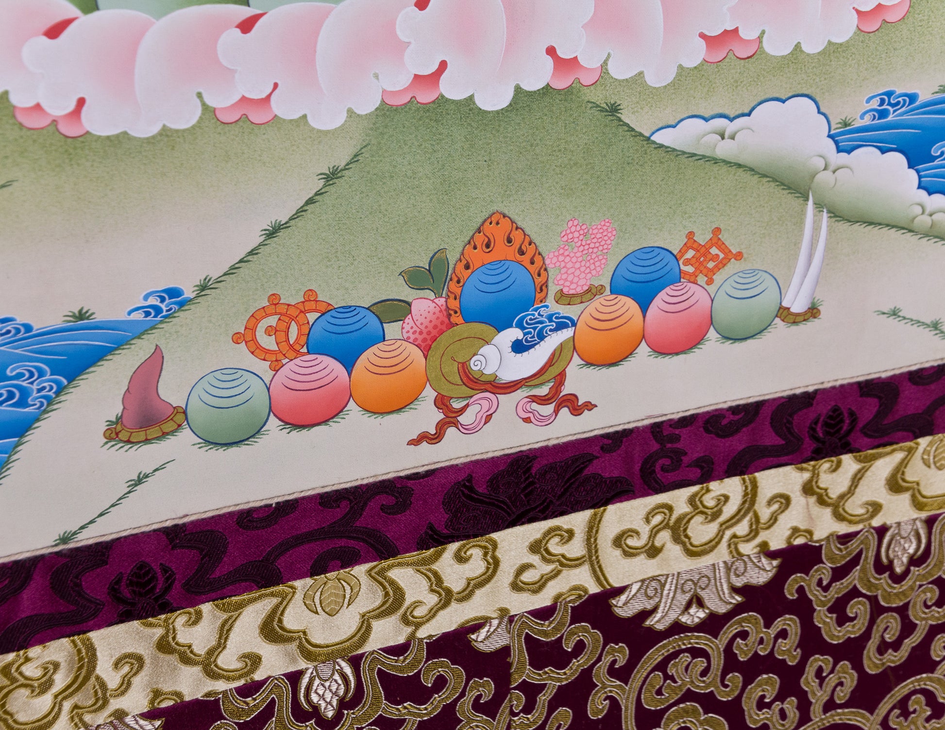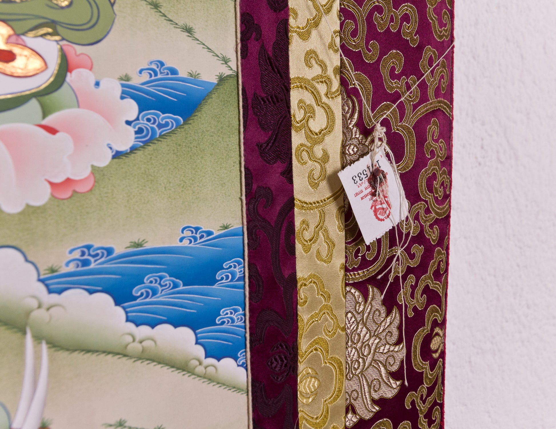 Alle unsere Thangkas werden direkt von den Herstellern in Nepal bezogen. Das Bild ist in einen Textilrahmen aus farbenfrohem tibetischem Seidenbrokat eingefasst, mit einem Vorhang zum respektvollen Schutz, wenn es nicht verwendet wird.