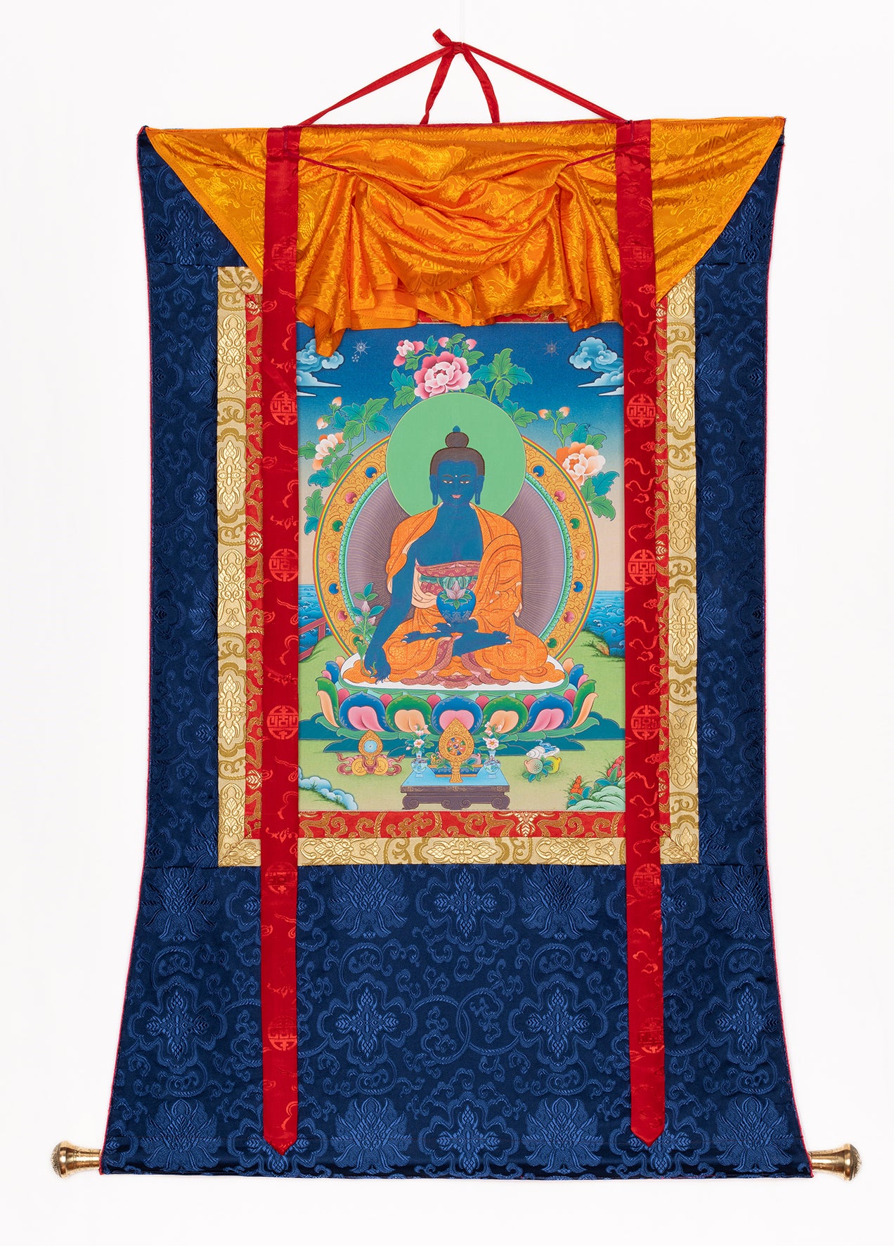 Alle unsere Thangkas werden direkt von den Herstellern in Nepal bezogen. Das Bild ist in einen Textilrahmen aus farbenfrohem tibetischem Seidenbrokat eingefasst, mit einem Vorhang zum respektvollen Schutz, wenn es nicht verwendet wird.