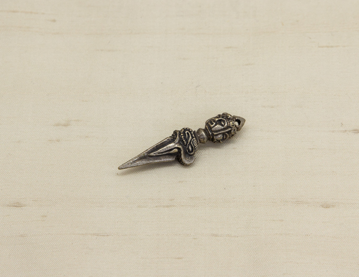 Der Phurba oder zornige Ritualdolch repräsentiert zornige männliche Energie, die alles befreit, was befreit werden muss. Die dreiseitige Klinge des Dolches, die aus den Kiefern eines Makara kommt, schneidet durch die drei Gifte Hass, Unwissenheit und Anhaftung. Die dreieckige Form repräsentiert das Feuerelement, und die geflochtenen Naga-Schwänze, die auf jeder Seite der Klinge eingeprägt sind, kommen aus dem Mund des Makara, da der Phurba oft verwendet wird, um lästige Nagas rituell zu unterwerfen. Der Dolch ist mit drei Gesichtern über zwei gewebten Knoten versehen, um drei Yidam-Gottheiten darzustellen, die dem Dolch Kraft verleihen.
