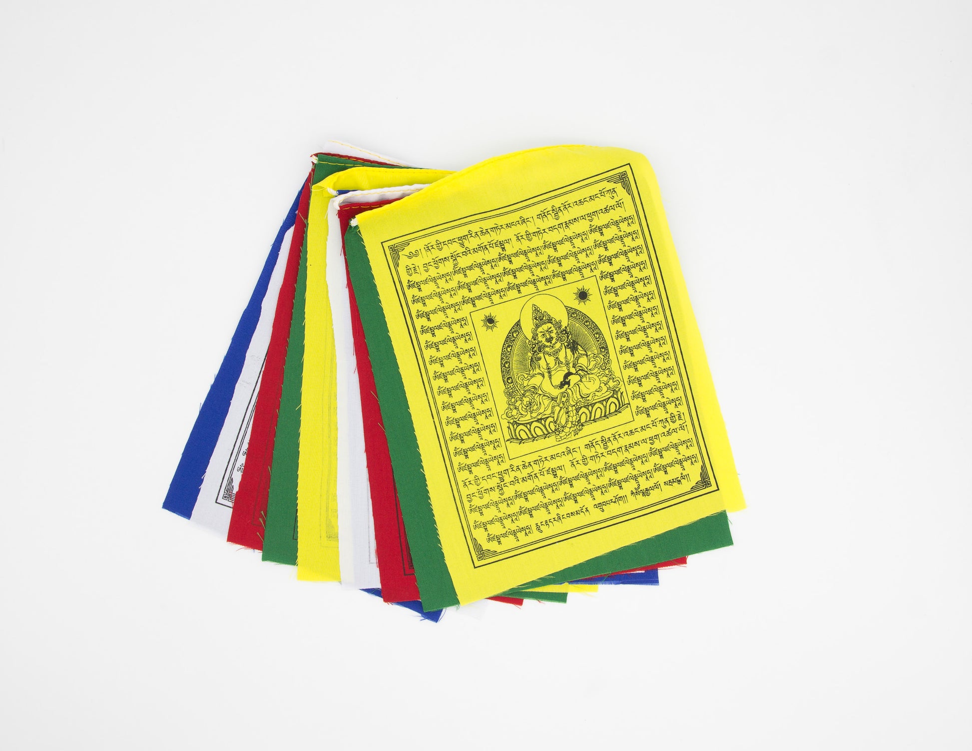 Einfarbige Gebetsfahnen beziehen sich im Allgemeinen auf die Eigenschaften der abgebildeten Gottheit. So steht Grün für die Grüne Tara, Blau für den Medizinbuddha, Weiß für Chenrezig, Rot für Guru Rinpoche oder Kurukulle und Gelb für das Windpferd oder Manjushri.