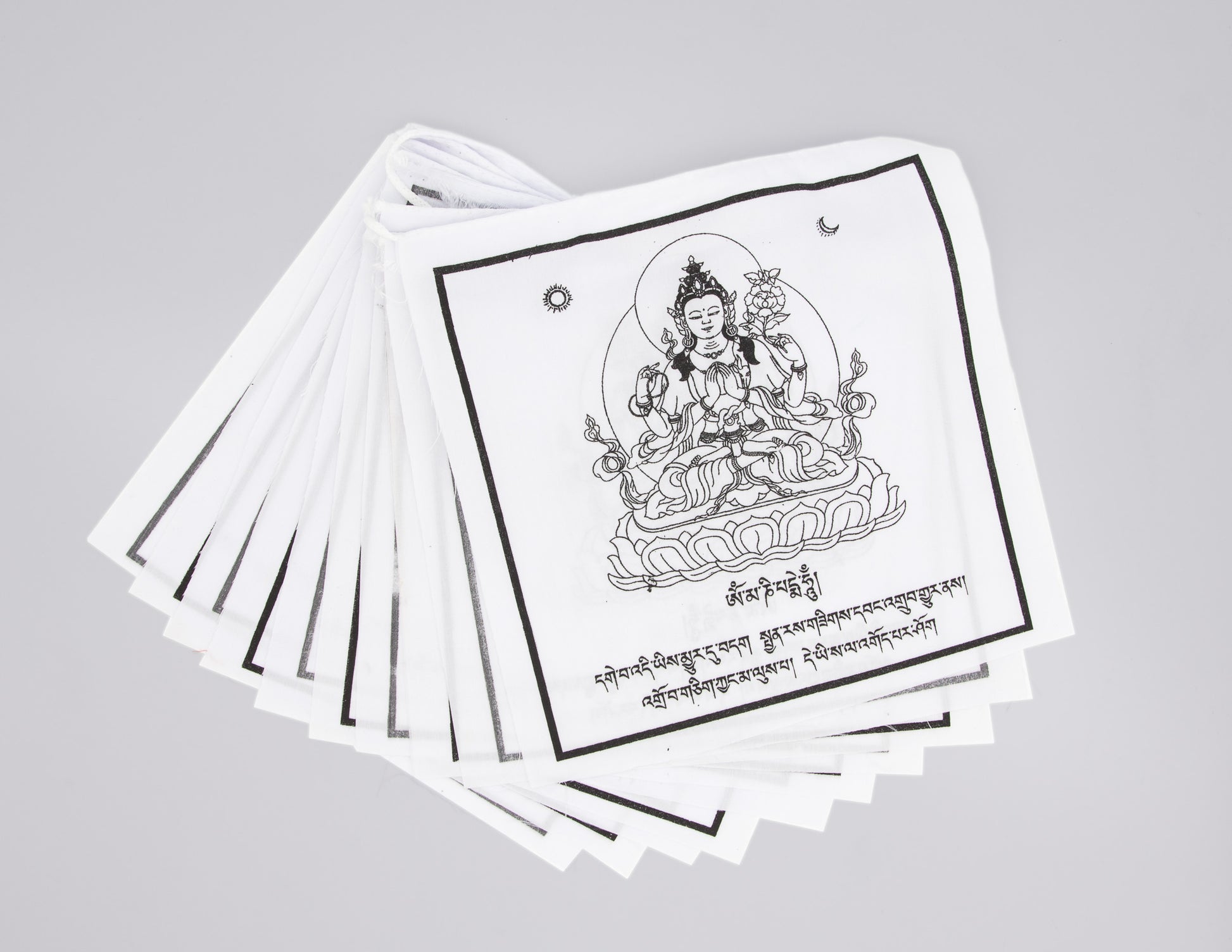 Vierarmige Chenrezig Gebetsfahnen, 20x20cm, Weiß