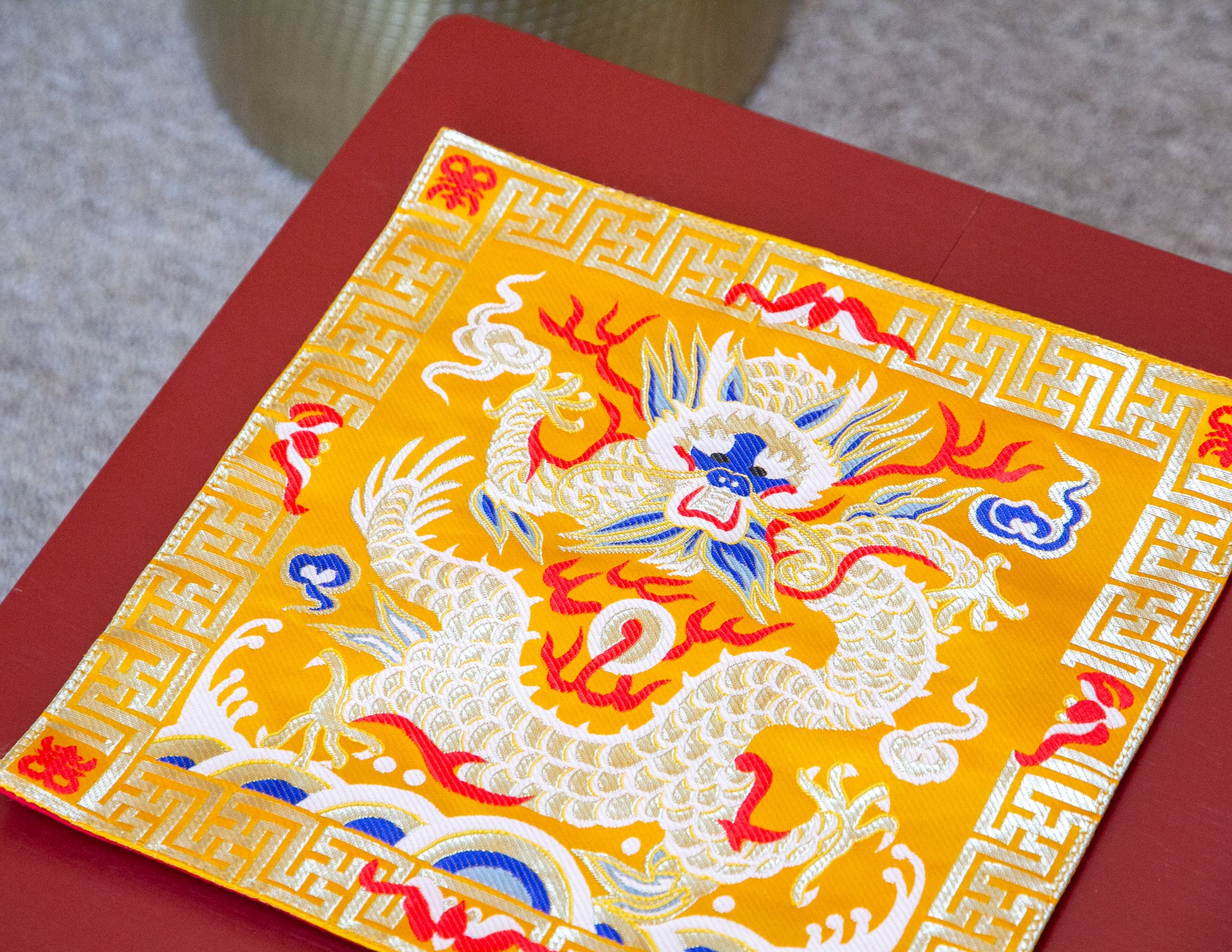 Brokattücher dienen als besondere Tischsets in der idealen Größe, um einen Schrein zu schmücken oder Ihre wertvollen Texte und Ritualinstrumente darauf zu platzieren. Um einen exotischen Hauch von Tibet oder dem Orient zu bringen, können Läufer auch verwendet werden, um jeden Tisch oder jede Oberfläche in Ihrem Zuhause zu dekorieren.