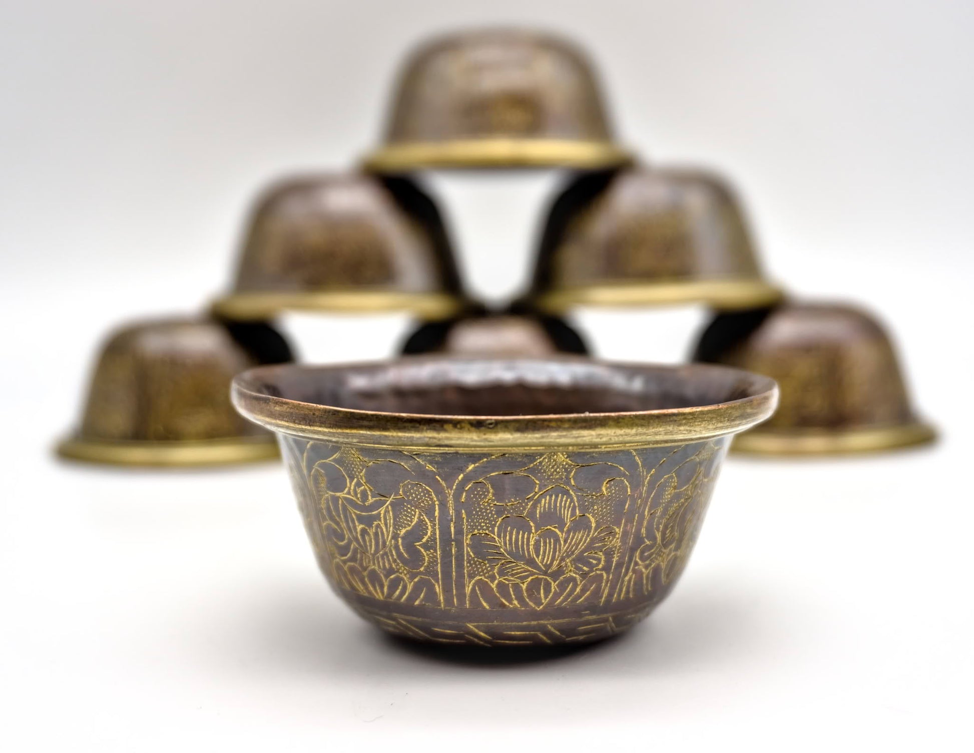 In the Buddhist context, we train in making daily offerings as a skillful means to instill the habit of selfless generosity. Moreover, we start our day by creating merit and an uplifting frame of mind. Traditionally, a set of 7 bowls are arranged on one’s altar to symbolize the offering of drinking water, bathing water, flowers, incense, light, perfume, food (Tib. shalsé), and a conch with a kusha grass wand.