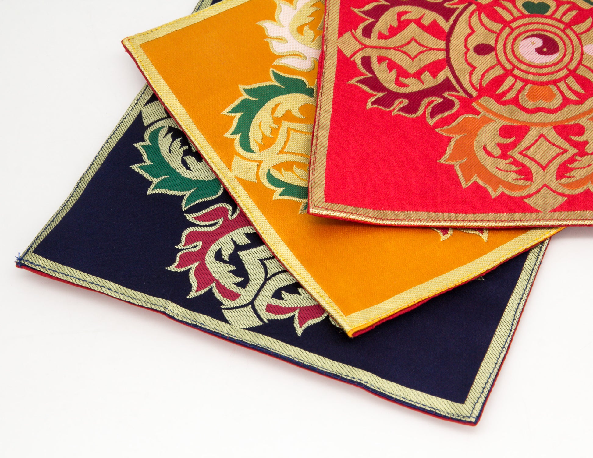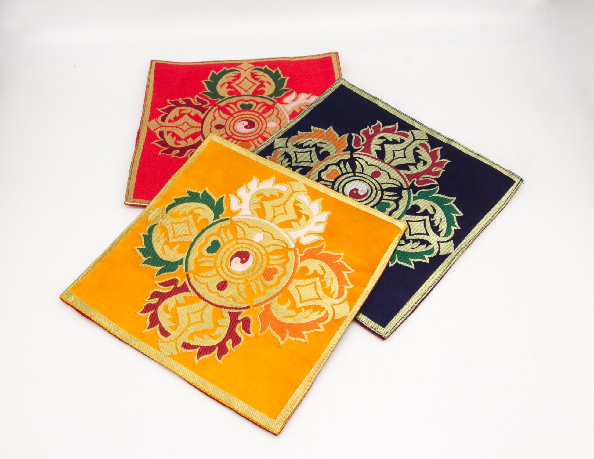 Ces tissus de brocard servent de set de table spécial dans la taille idéale pour orner son sanctuaire, ou pour vos précieux textes et instruments de rituels. Pour apporter une touche exotique du Tibet ou de l'Orient, ces tissus de table peuvent également être utilisés pour décorer n'importe quelle table ou surface de votre maison.