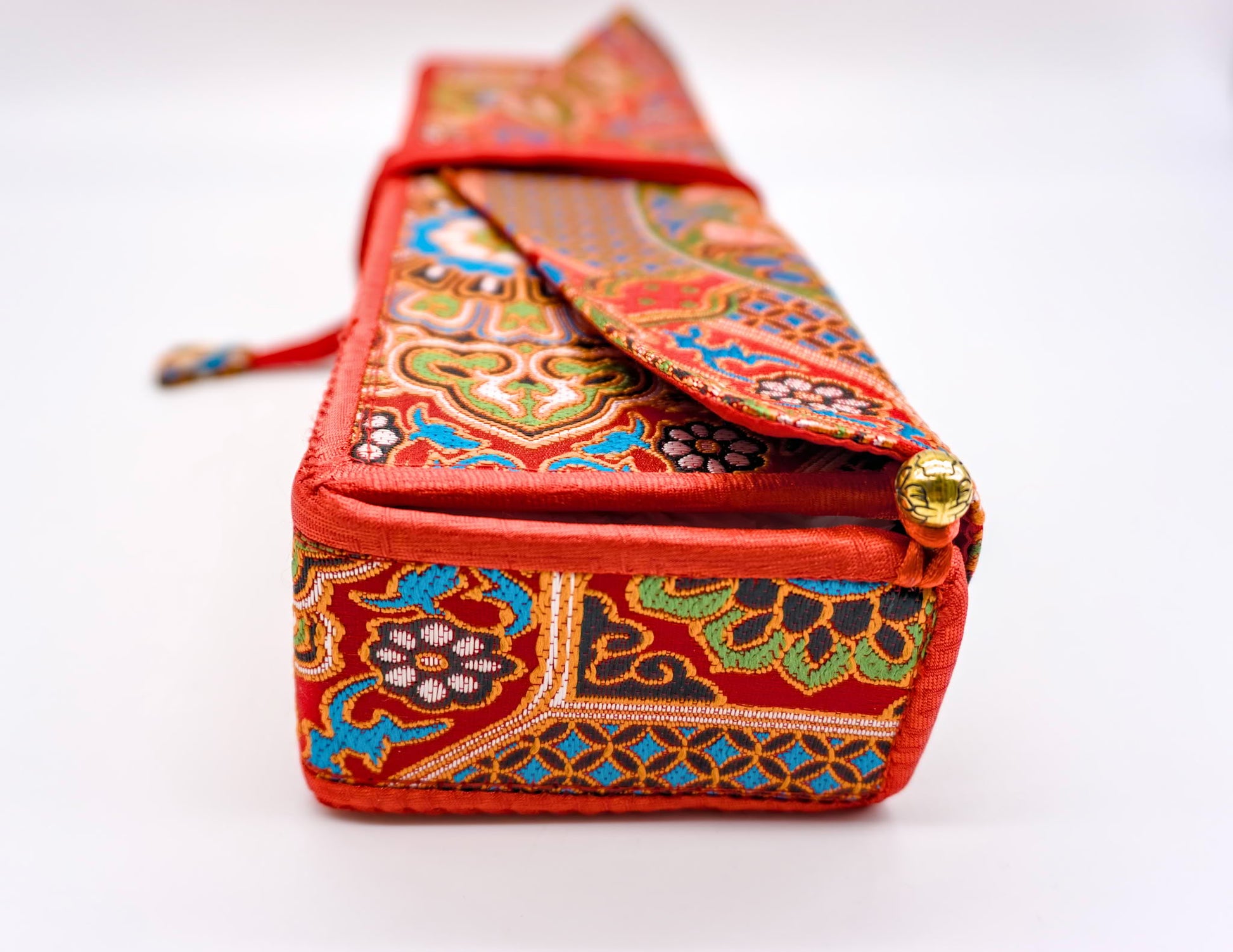 The pecha support, crafted in traditional silk brocade, is an essential aid for reading your Buddhist texts.