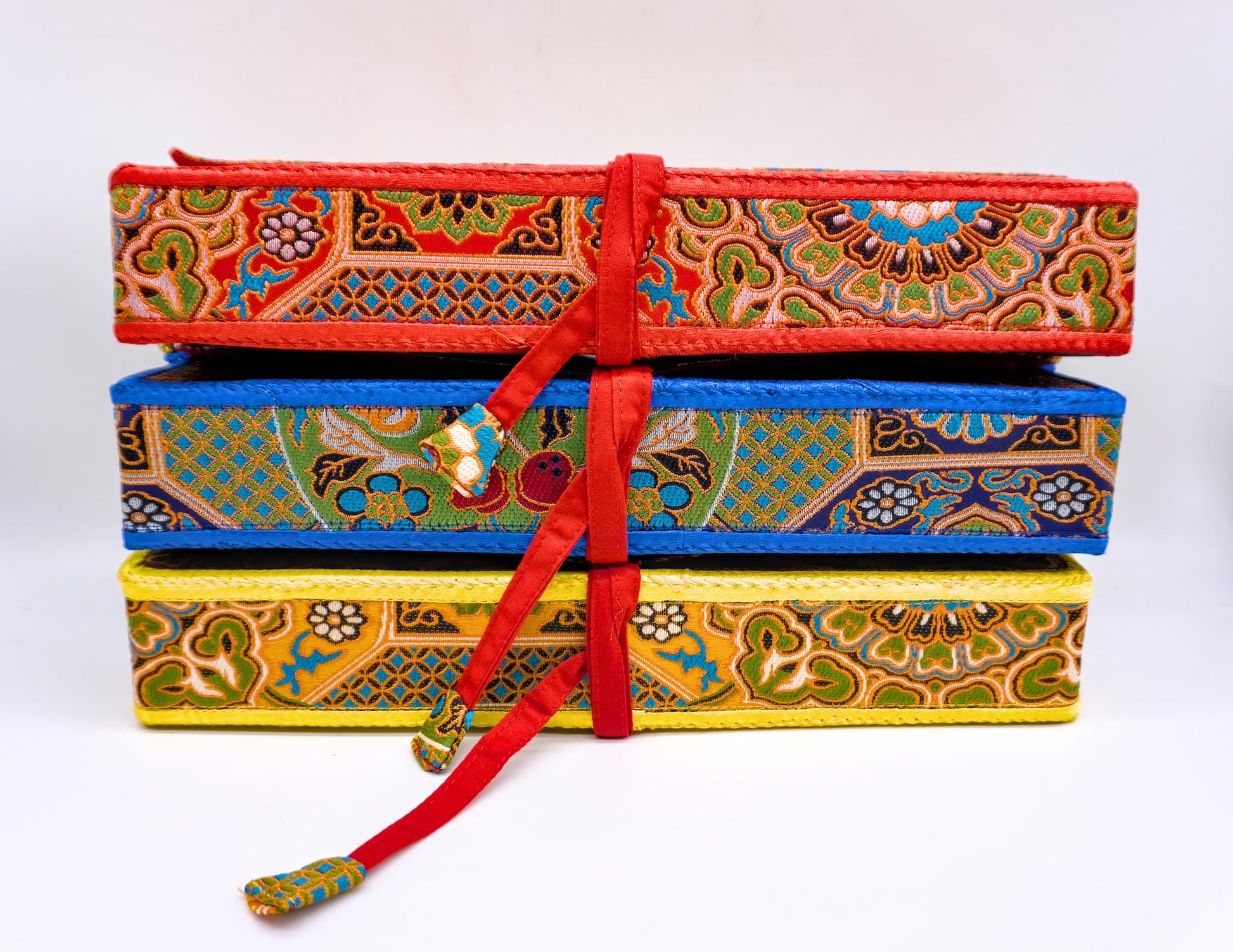 Hand-made in Nepal, our pecha supports feature a beautifully patterned silk brocade exterior and a soft cotton cloth interior. Open, the support sits upright, holding your text securely while freeing your hands and making your practice more comfortable. Closed, it safely stores your scriptures between sessions, protecting them from dust, dampness, and wear.
