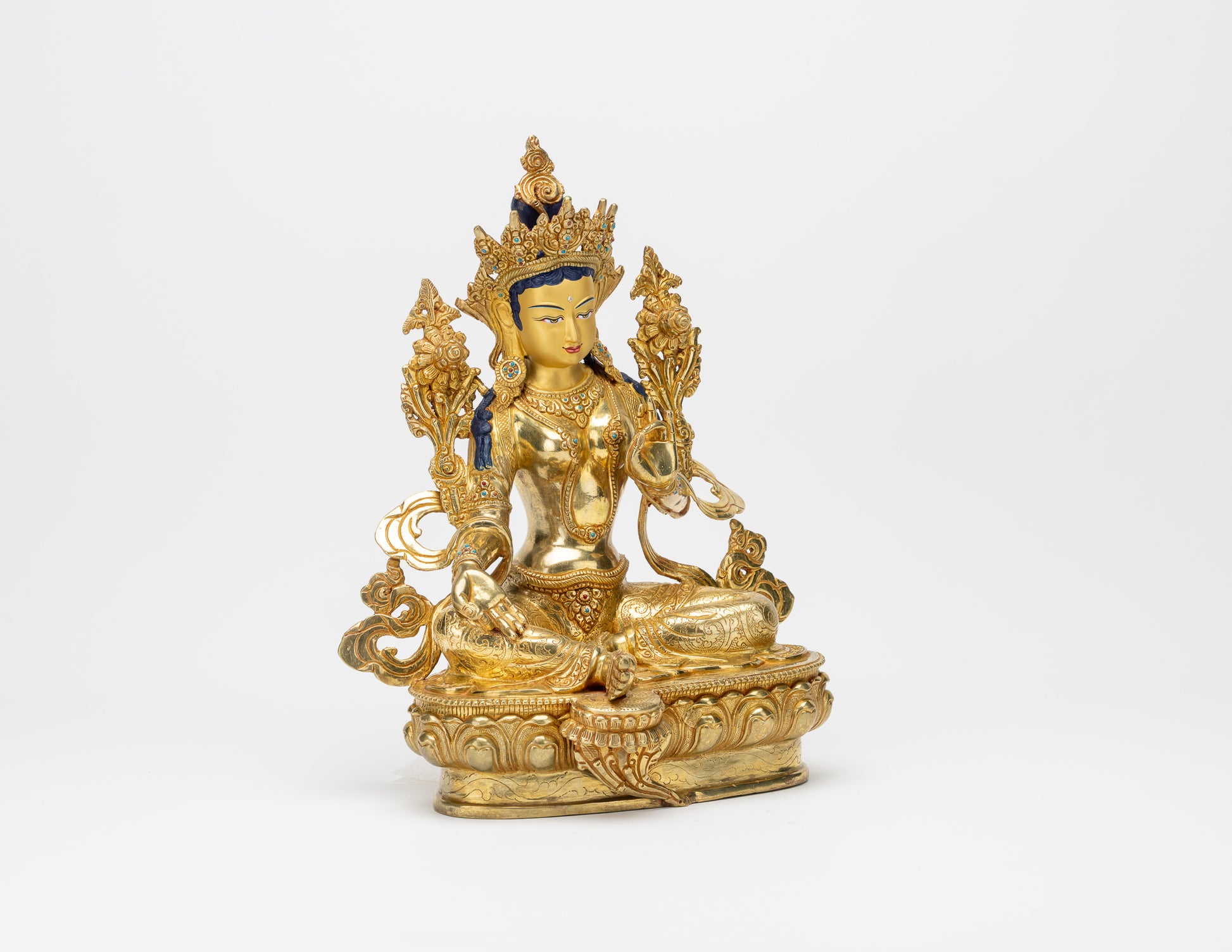 Finely crafted copper statue of Green Tara, fully guilded in gold. The face is delicately hand painted with pure gold pigment.