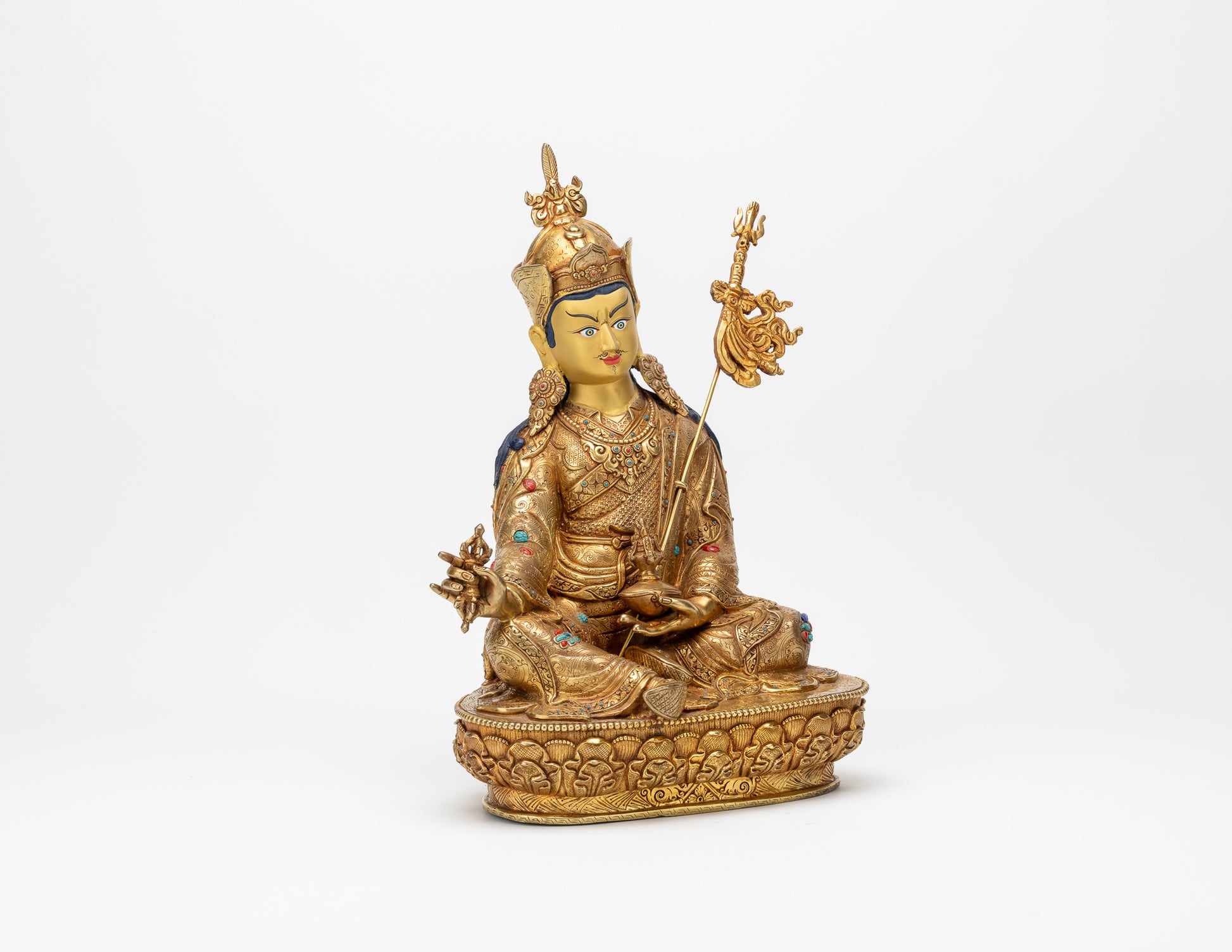 Finely crafted copper statue of Guru Rinpoche, fully guilded in gold. The face is delicately hand painted with pure gold pigment.