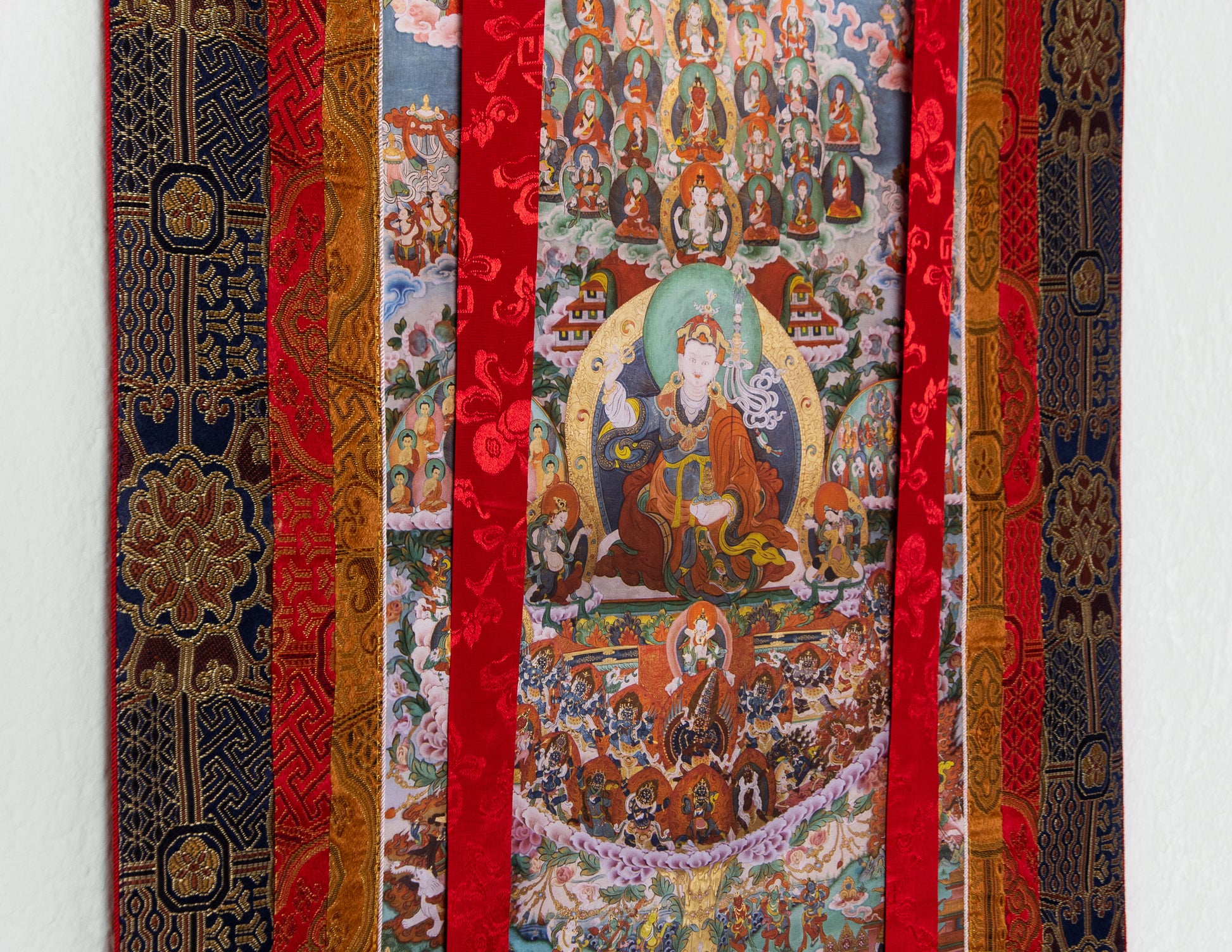 All of our thangkas are sourced directly from the makers in Nepal. The image is mounted into a textile frame of colourful Tibetan silk brocade, with a curtain for respectfully protecting when not in use.