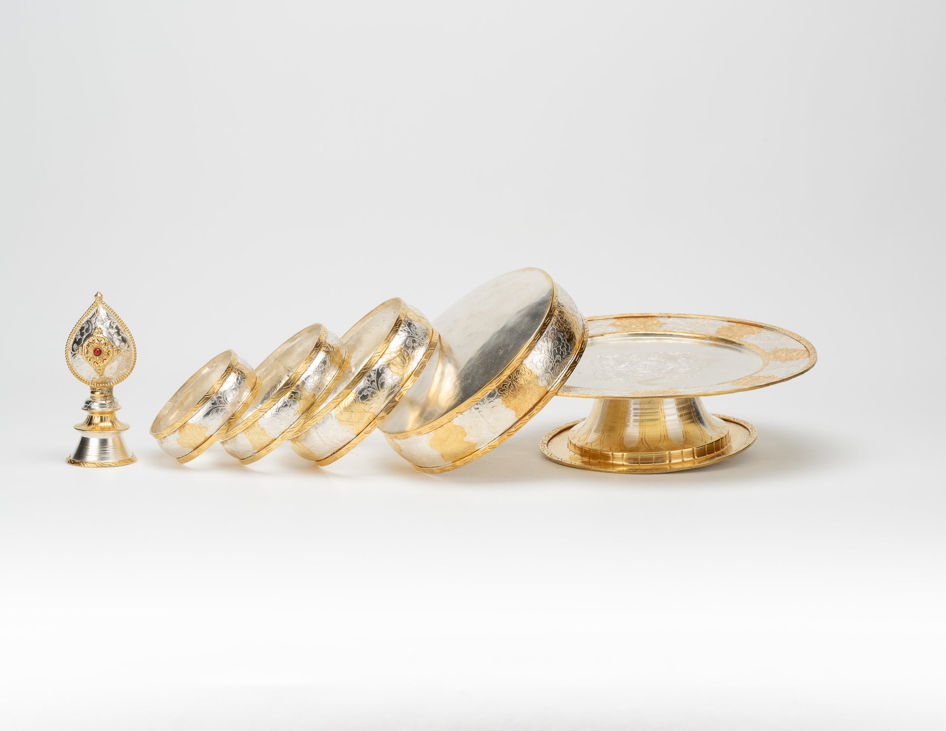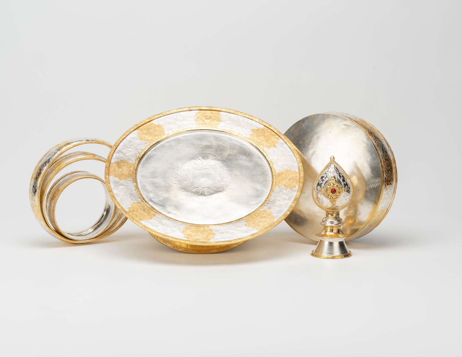 Our traditional mandala offering plate with rings, crafted in a polished finish. This version features a smooth metal plate lightly engraved with auspicious motifs.