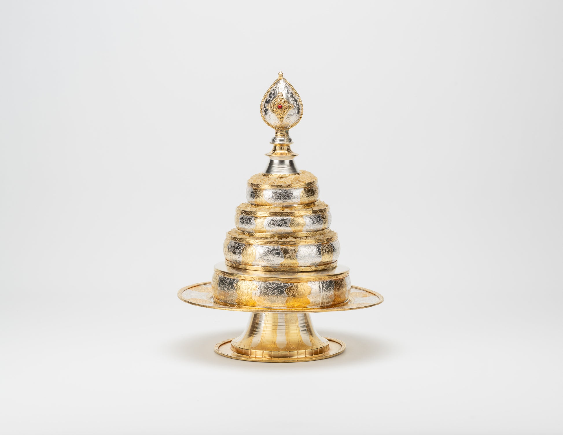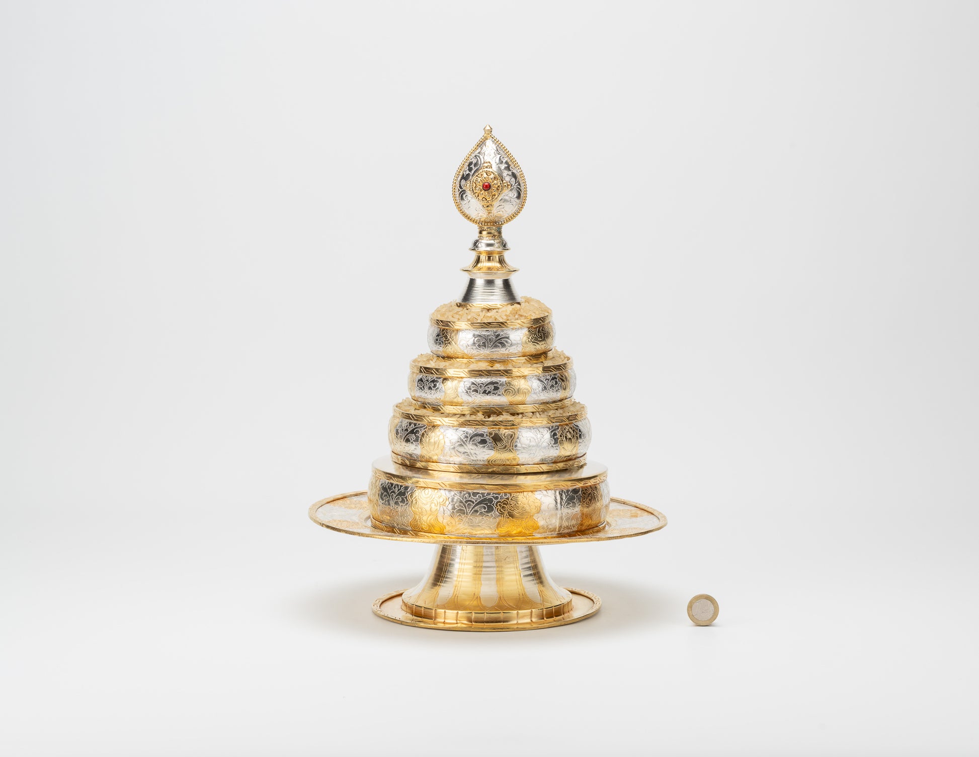 The Tibetan Buddhist mandala offering represents the entire idealised cosmos including mystical Mount Sumeru, the sun, the moon, the stars, planets, the earth and oceans, while the grains of rice we offer represent all sentient beings, their wealth, enjoyments, etc. With this ritual set, one symbolically offers to the Buddhas and one’s Teacher everything imaginable thereby increasing one’s generosity and generating the two kinds of merit: the merit of wisdom and the merit of accumulations. It is said to help the practitioner accomplish the Six Transcendent Perfections.