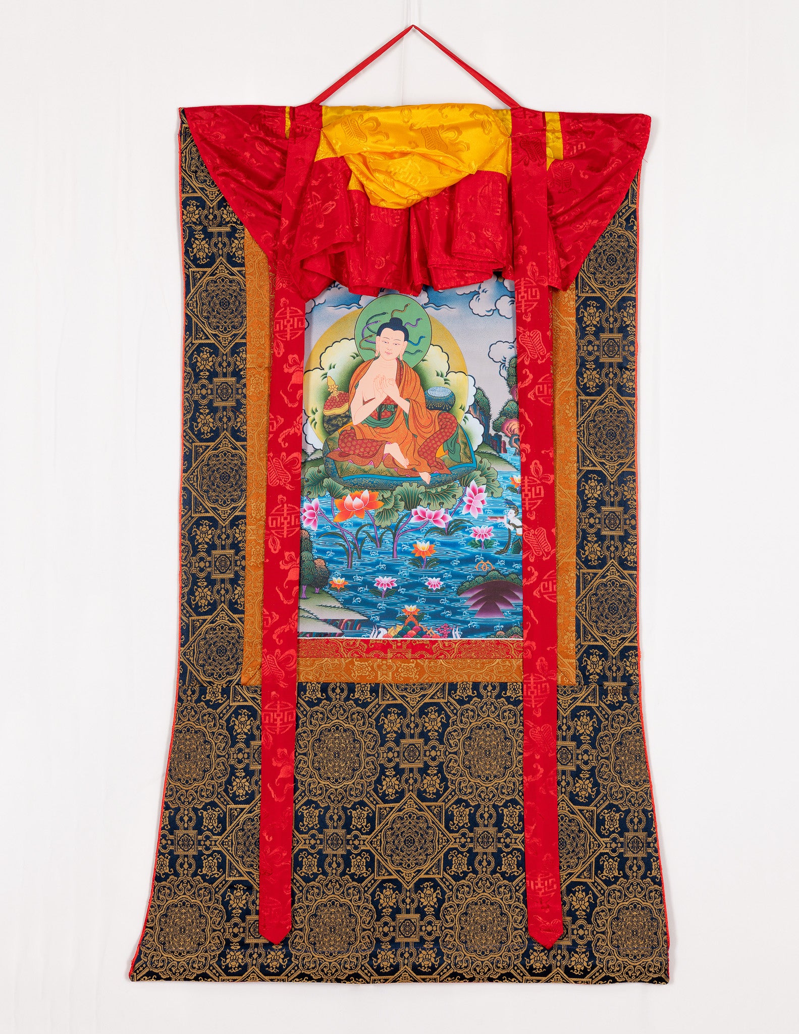 All of our thangkas are sourced directly from the makers in Nepal. The image is mounted into a textile frame of colourful Tibetan silk brocade, with a curtain for respectfully protecting when not in use.