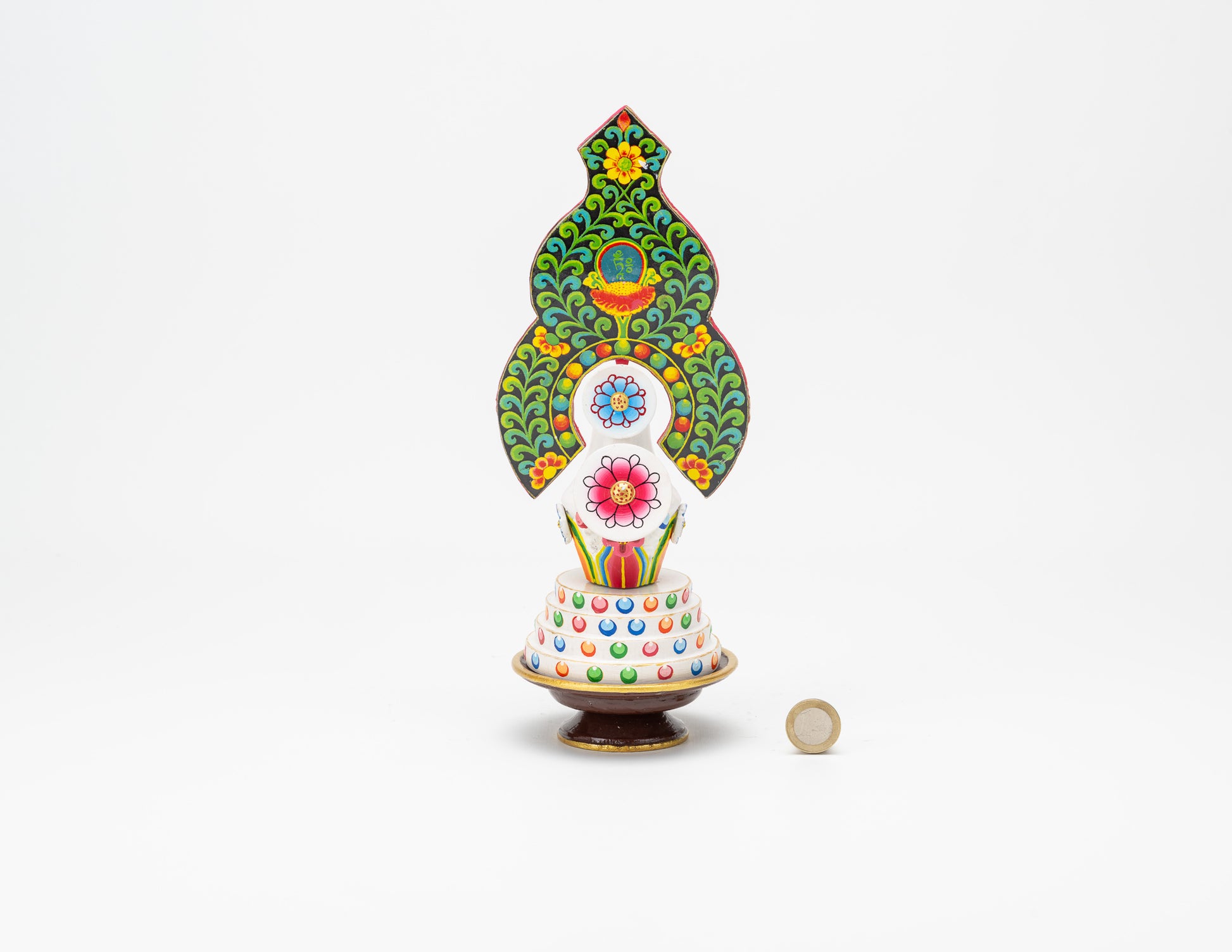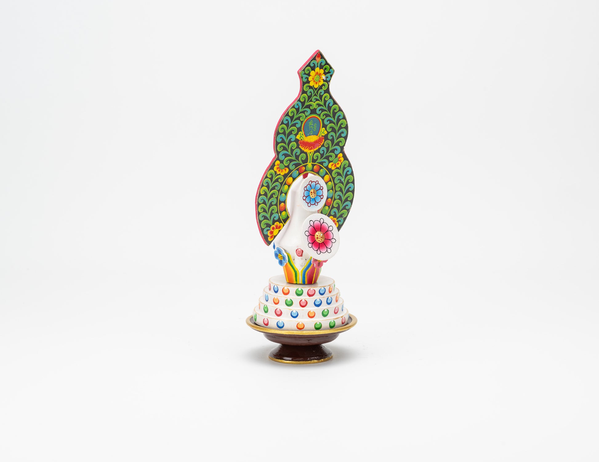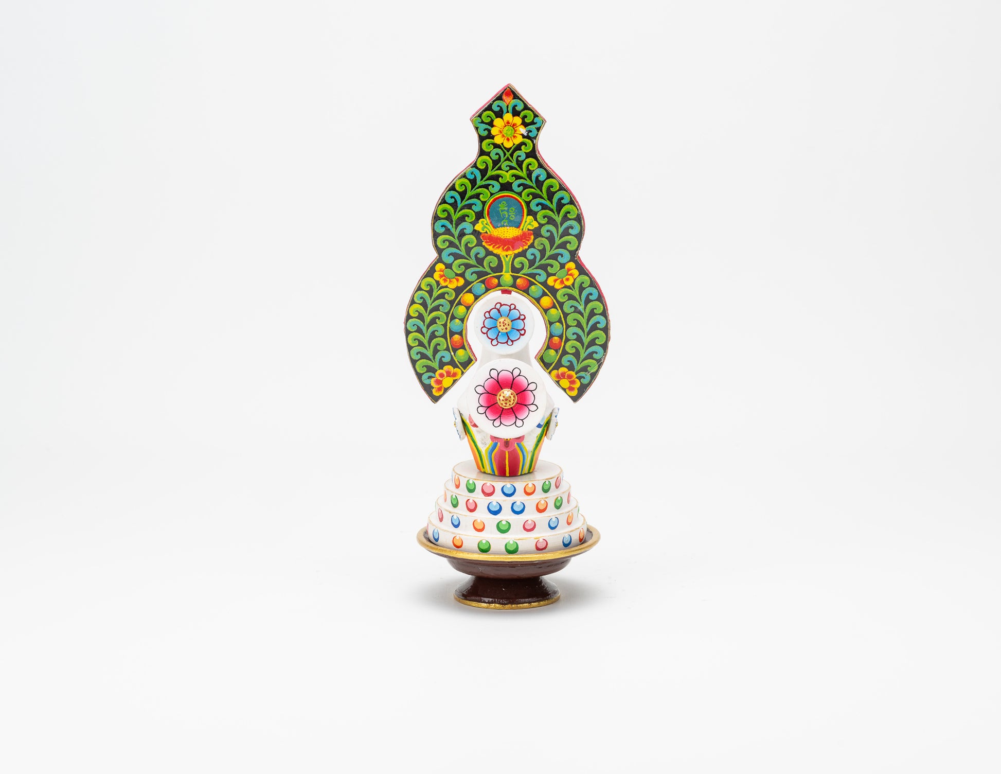 Carved in lightweight yet resilient wood, tormas are brightly painted with enamel. The shape, ingredients, and color of a torma varies depending upon to whom it will be offered.