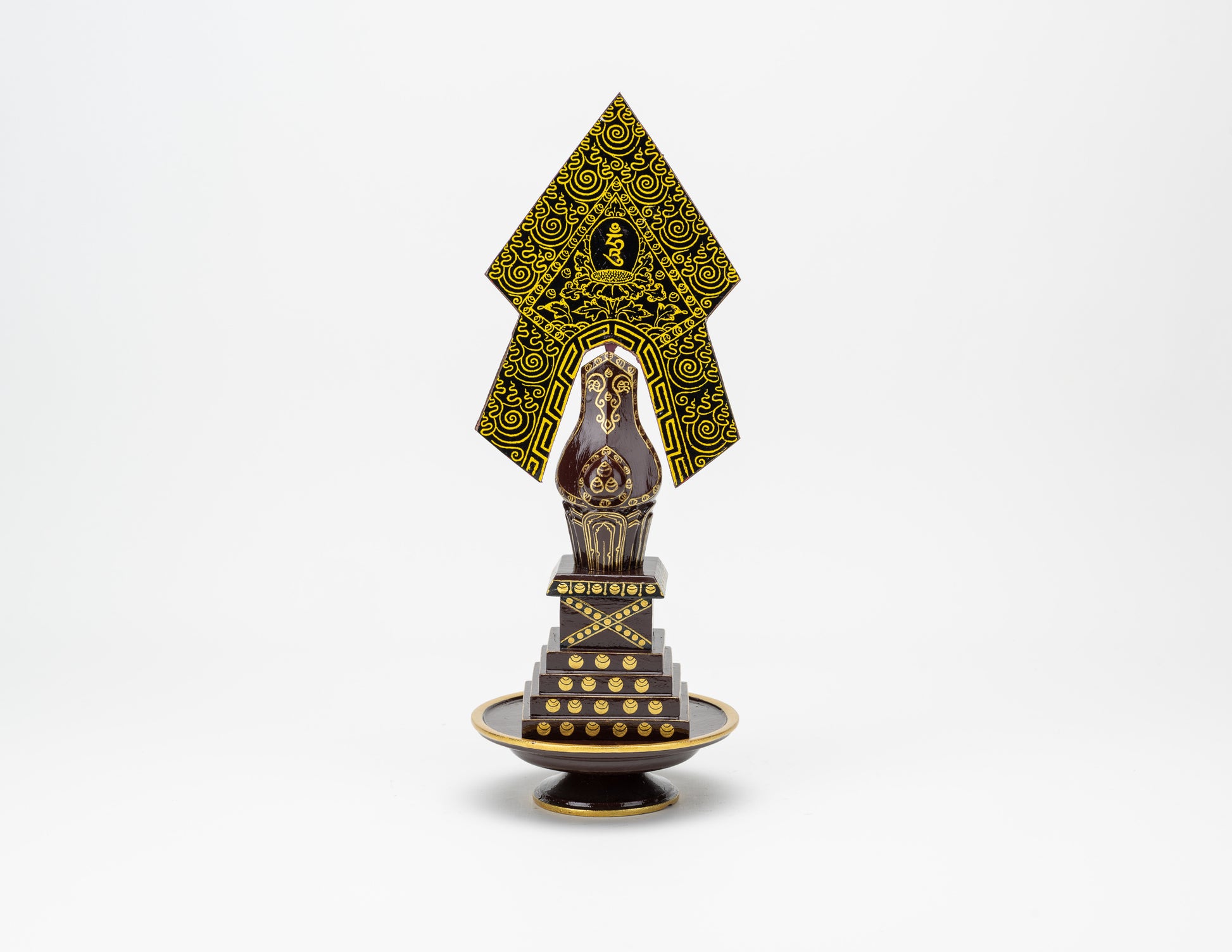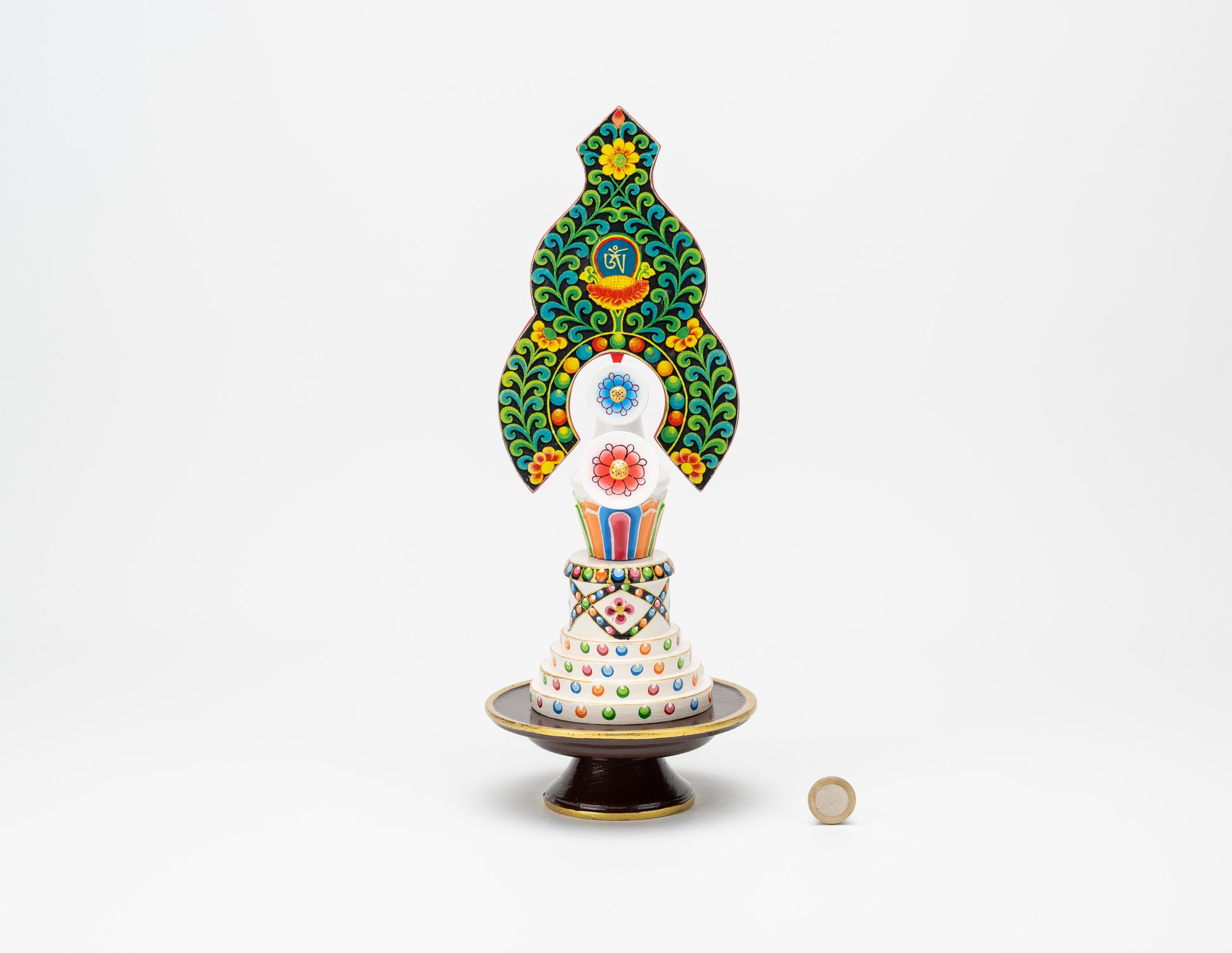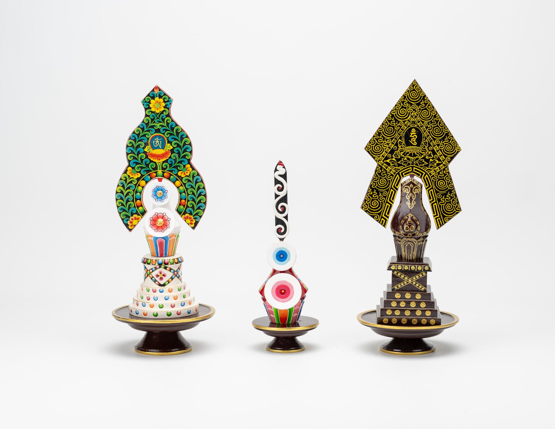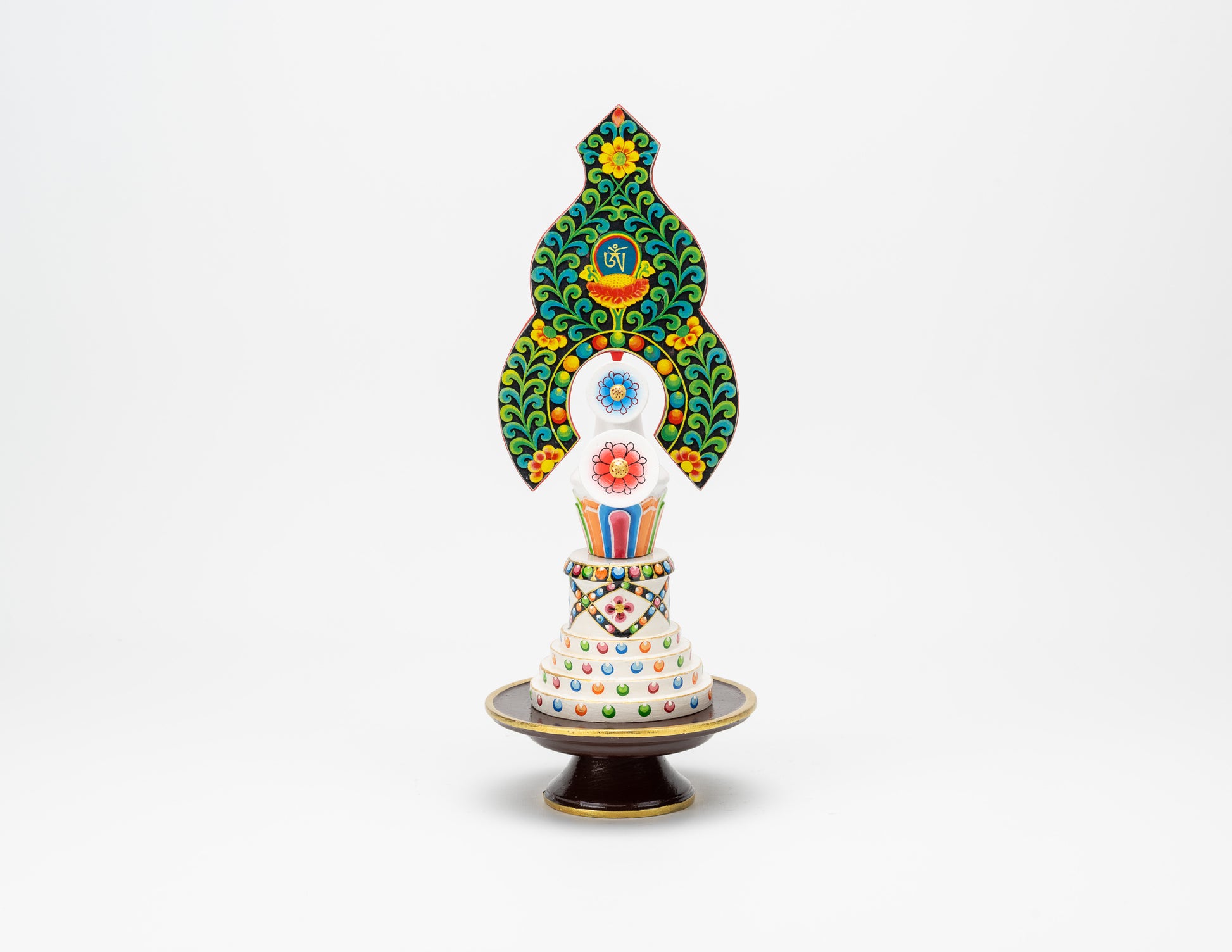 Carved in lightweight yet resilient wood, tormas are brightly painted with enamel. The shape, ingredients, and color of a torma varies depending upon to whom it will be offered.