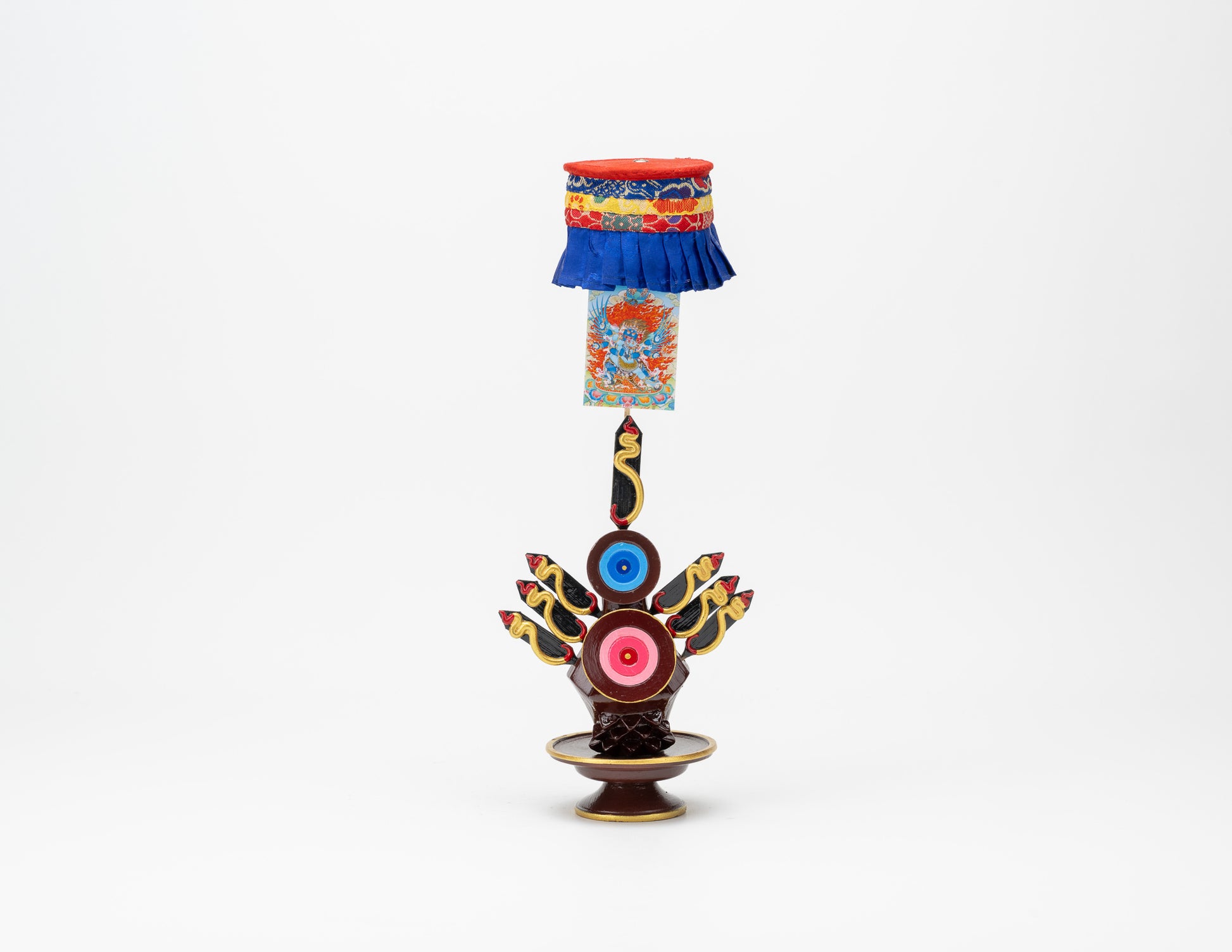 Carved in lightweight yet resilient wood, tormas are brightly painted with enamel. The shape, ingredients, and color of a torma varies depending upon to whom it will be offered.
